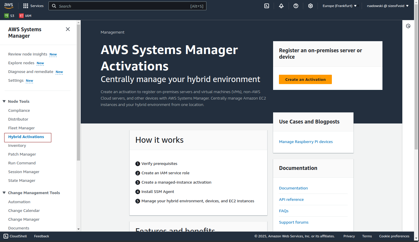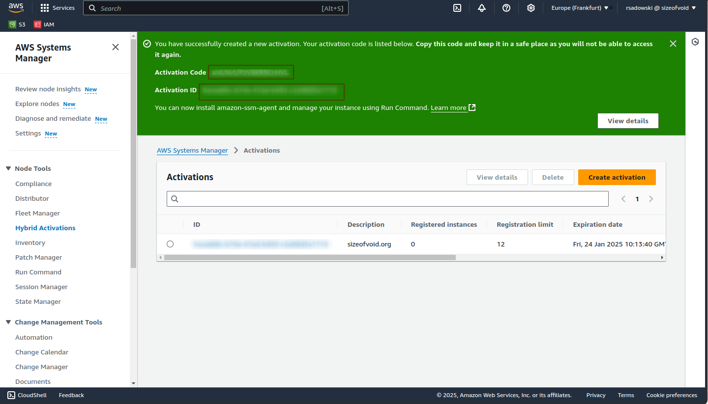 AmazonSSMFullAccesspolicy rights. Then navigate to AWS Systems Manager main window and select Hybrid Activations under Node Tools. You can find it on the left side